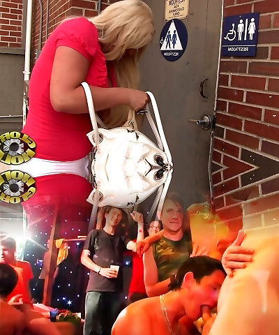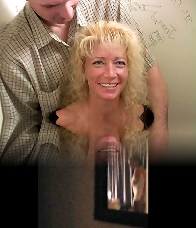Busty blonde milf with meaty round tits enjoys her time in a gloryhole room