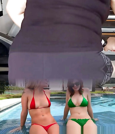 Touching his hard dick while I display off my cameltoe in a sexy little cut-offs and swimsuit.