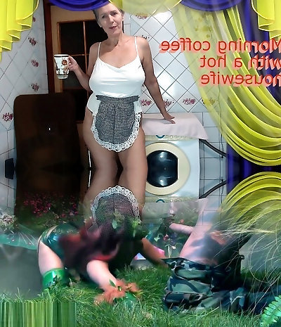 Steaming housewife Lukerya. Fun flirting in the kitchen while sitting on the washing machine. Bottom view.
