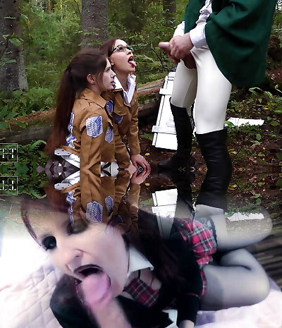 Attack on titan. Grubby threesome blowjob for commander in the forest
