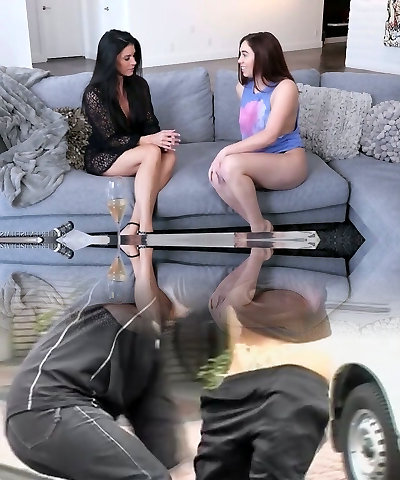 VIP4K. Dominant brunette in black stockings uses big toy to impress her Gf