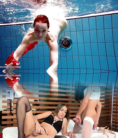 Cute stunner in red sexy open dress swimming
