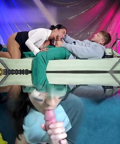 Nurse in black pantyhose drains him off on her mind-blowing legs