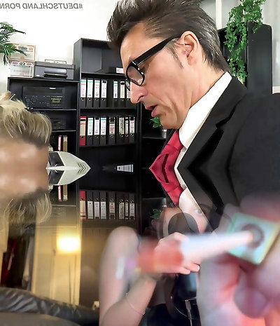 Handsome and busty German milf assistant with glasses and an ugly guy